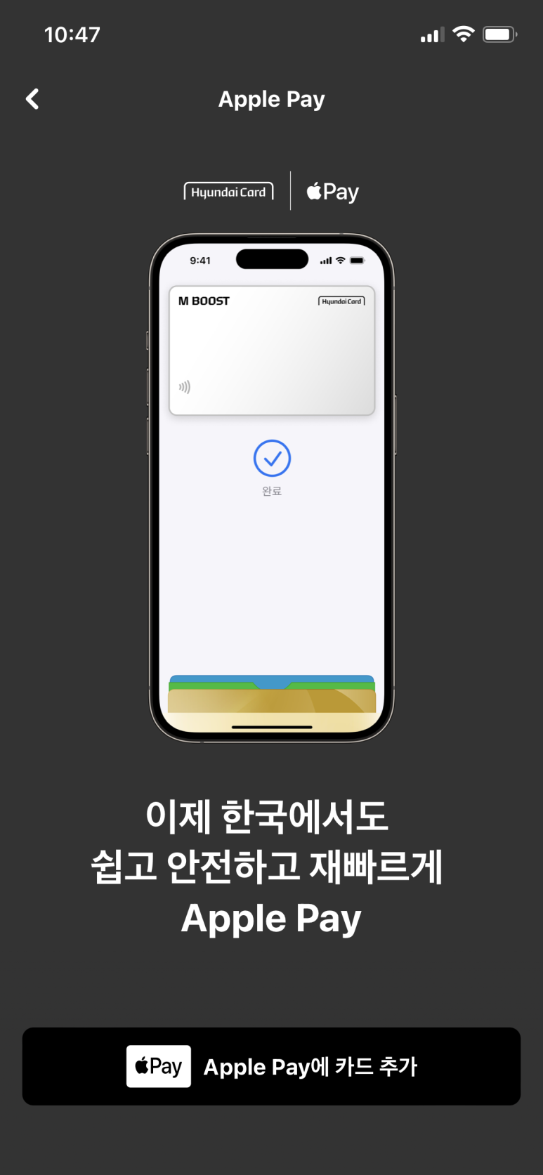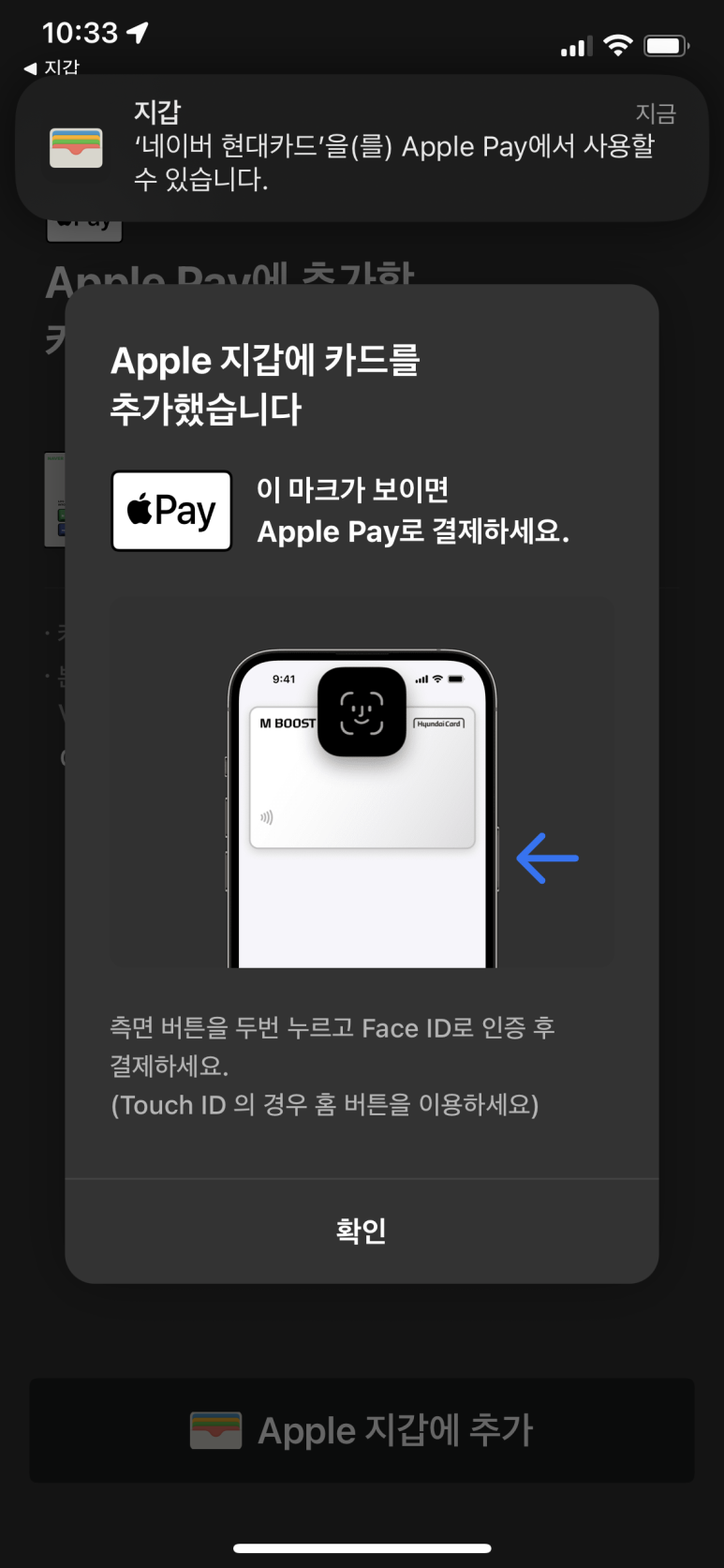 애플 페이에 현대카드를 추가하라는 배너가 나옵니다