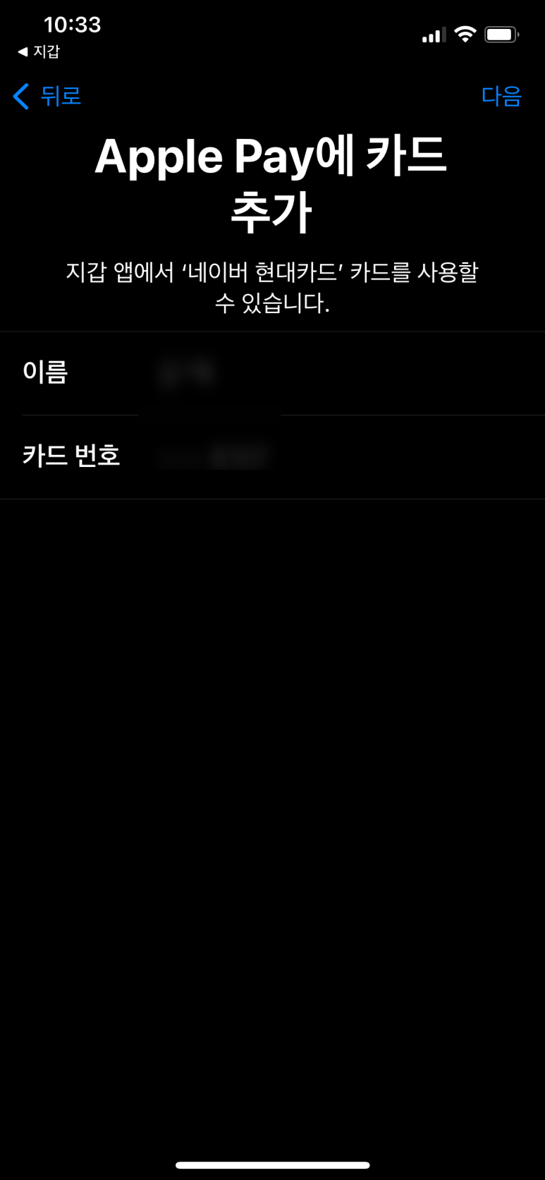 네이버 현대카드를 애플 지갑에 추가 클릭