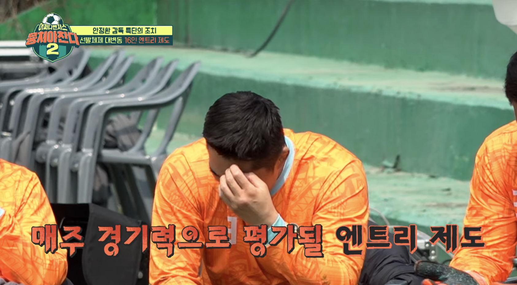 사실 예능이죠? 뭉쳐야찬다 시즌2는 그동안 모든 선수들에게 기회를 주는 편이었습니다. 부상만 아니라면 1~2분이라도 출전을 하게 했었고, 심지어 체력부담이 크게 없는 골기퍼 포지션의 경우, 교체가 필요없음에도 3명의 골기퍼를 교체하기도 하였는데요. 안정환 감독은 제주도 도장깨기 실패이후에도 여러번 기회를 주었지만~ 연습을 하지 않는 선수들로 인해 대대적인 변화를 예고했었습니다.