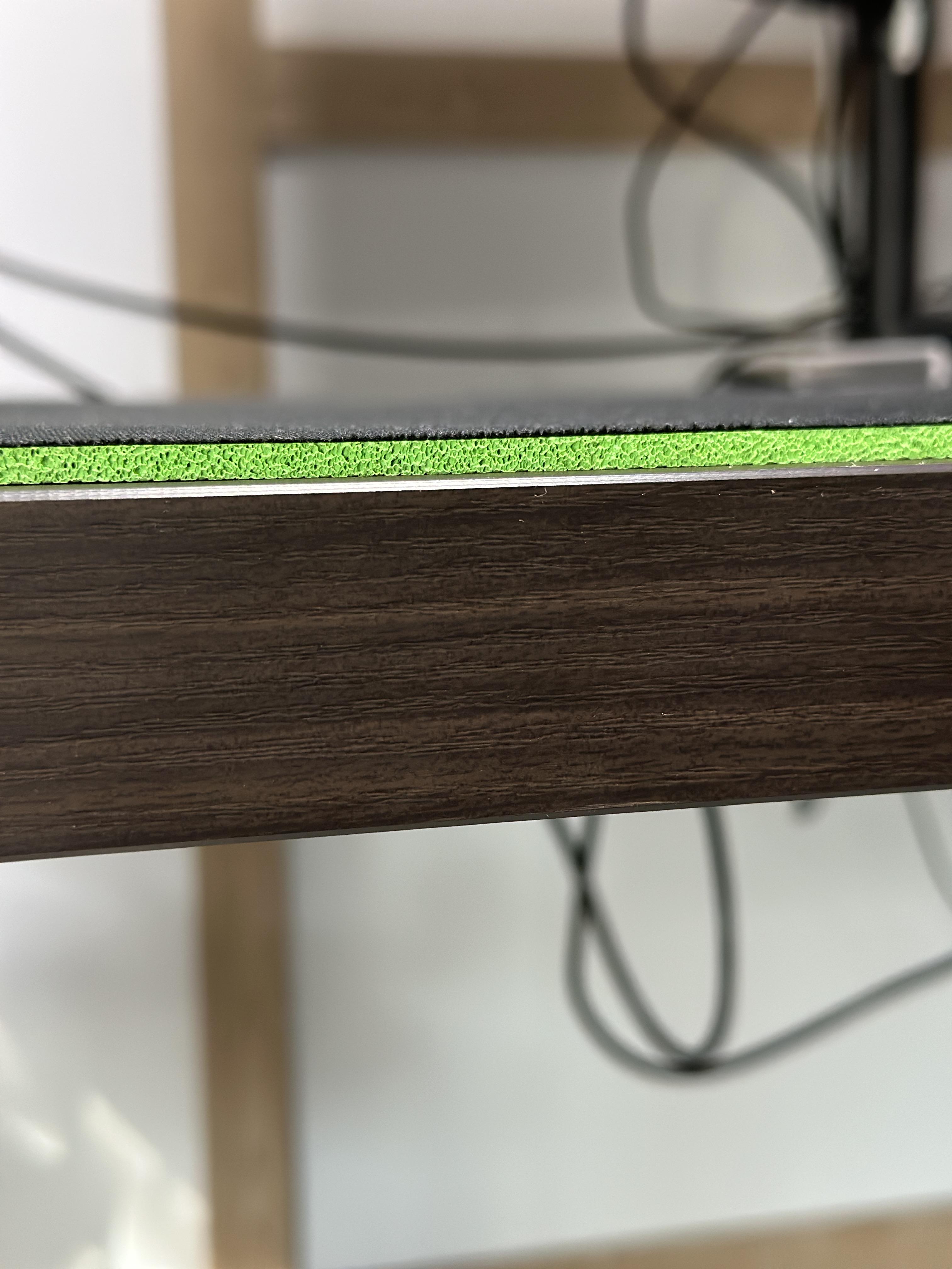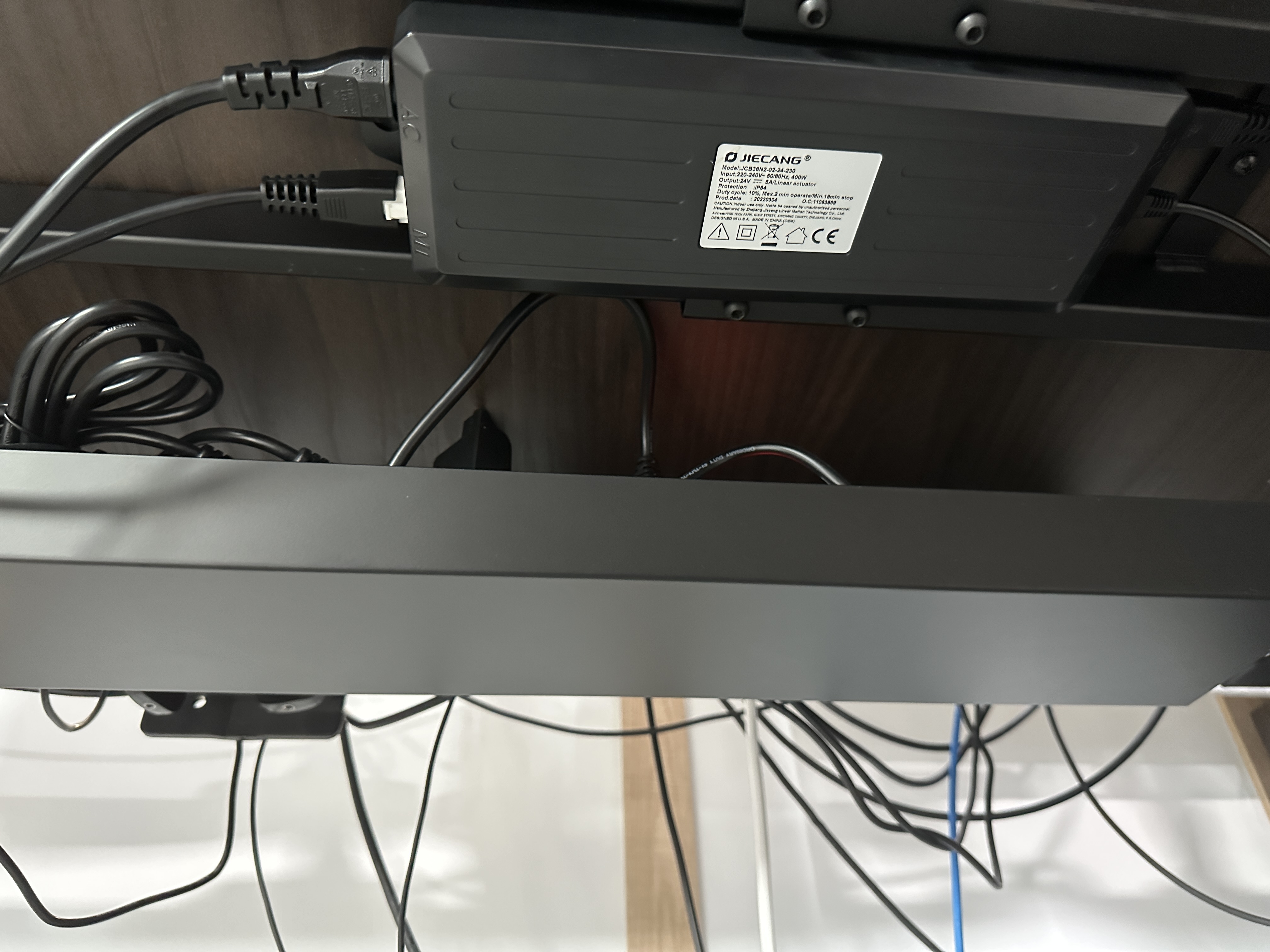 상판이 깔끔한대신, 구멍이 없기 때문에 선이 노출이 됩니다. 상판 아래에 있는 케이블 트레이도 조금 작은 느낌이 있어, 선 정리하는 것이 힘들었습니다. 저는 옵션에 있는 케이블 덕트를 구매하지 않았는데요. 조금 마감이나 퀄리티, 방식이 아쉬웠습니다. 최근에 다른 브랜드들에서는 개선이 되고 있는 부분이라서 1년이 지난 지금, 개선점이 없다는 점은 더 아쉽게 느껴집니다. 마그내틱 커버 등 다른 방법이 좀 있었으면 좋겠네요.